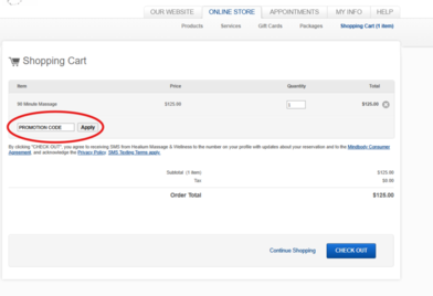Please go to our online site, schedule a massage, once in the CHECK OUT/ORDER page enter your GIFT CERTIFICATE number in the box above the payment area. Not to be confused with the pop-up window asking for credit card info. PROMO CODES are before the checkout page, in your SHOPPING CART screen. Gift Certificates and promo codes cannot be redeemed on the MindBody phone app.