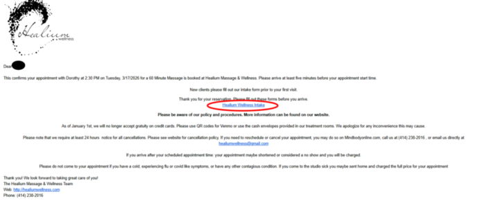 There is a link for the intake form on your confirmation email. please fill out prior to arriving. You only need to fill out once unless your health history has changed.